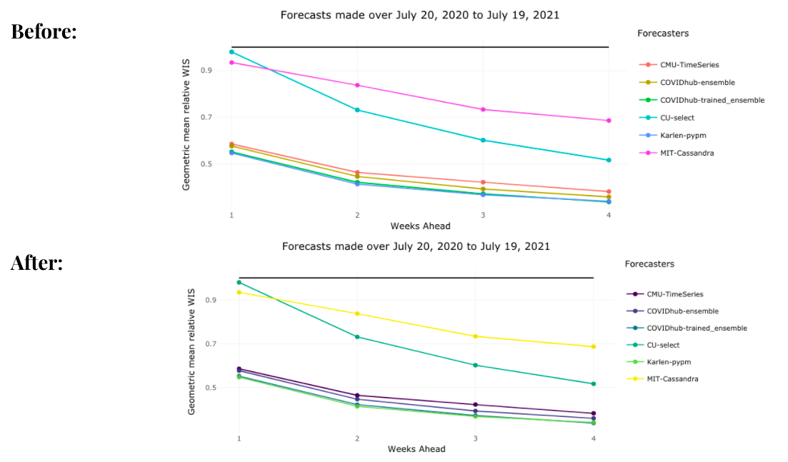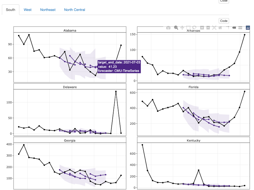 This project was completed by a team of fellows as part of Stanford’s Data Science for Social Good program in the Summer of 2021, working on a project originated by DELPHI research group at Carnegie Mellon University. The end goal of our project is to develop tools for comparing and evaluating COVID-19 forecasters for deaths, cases, and hospitalizations in the United States, aiming to help epidemiological researchers gain insights into the performance of their forecasts and lead to more accurate forecasting of epidemics in the future. You can read our final report in this directory and view the slides from our final presentation and final report.