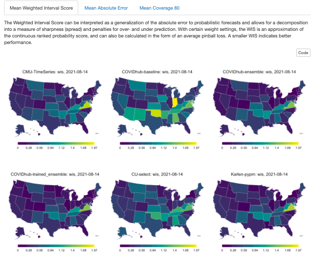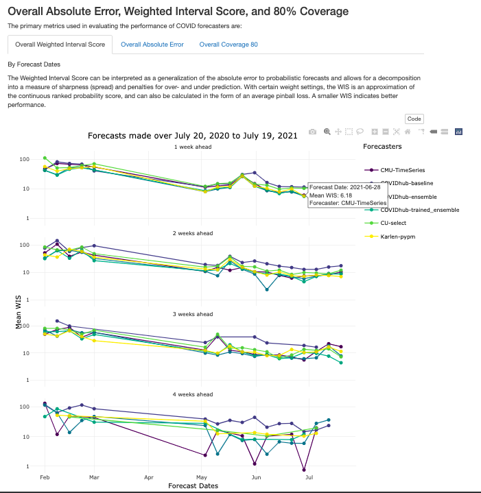 To contextualize the forecast evaluations, the following tabs illustrate the performance of COVID-19 forecasts across all US states over forecast dates and weeks ahead, as shown in Figure 6. Note that the results are scaled by population.