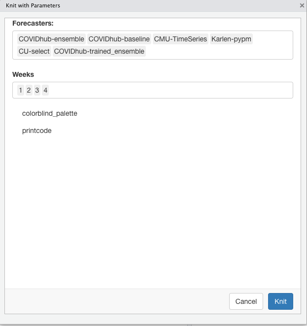 Parameterized reports allow users to choose one or more parameters to customize the analysis, which users can reproduce the analysis at the click of a button. We started by specifying the parameters using the “params” field within the YAML section. Setting paramters inputs (forecasters, weeks, and colorblind palette) shortened the coding lines in the report. The helper function was added to pull all available forecasters from the Covid-19 Forecast Hub. We now rely on parameters and helper functions to easily change the markdown parameters, as shown below.