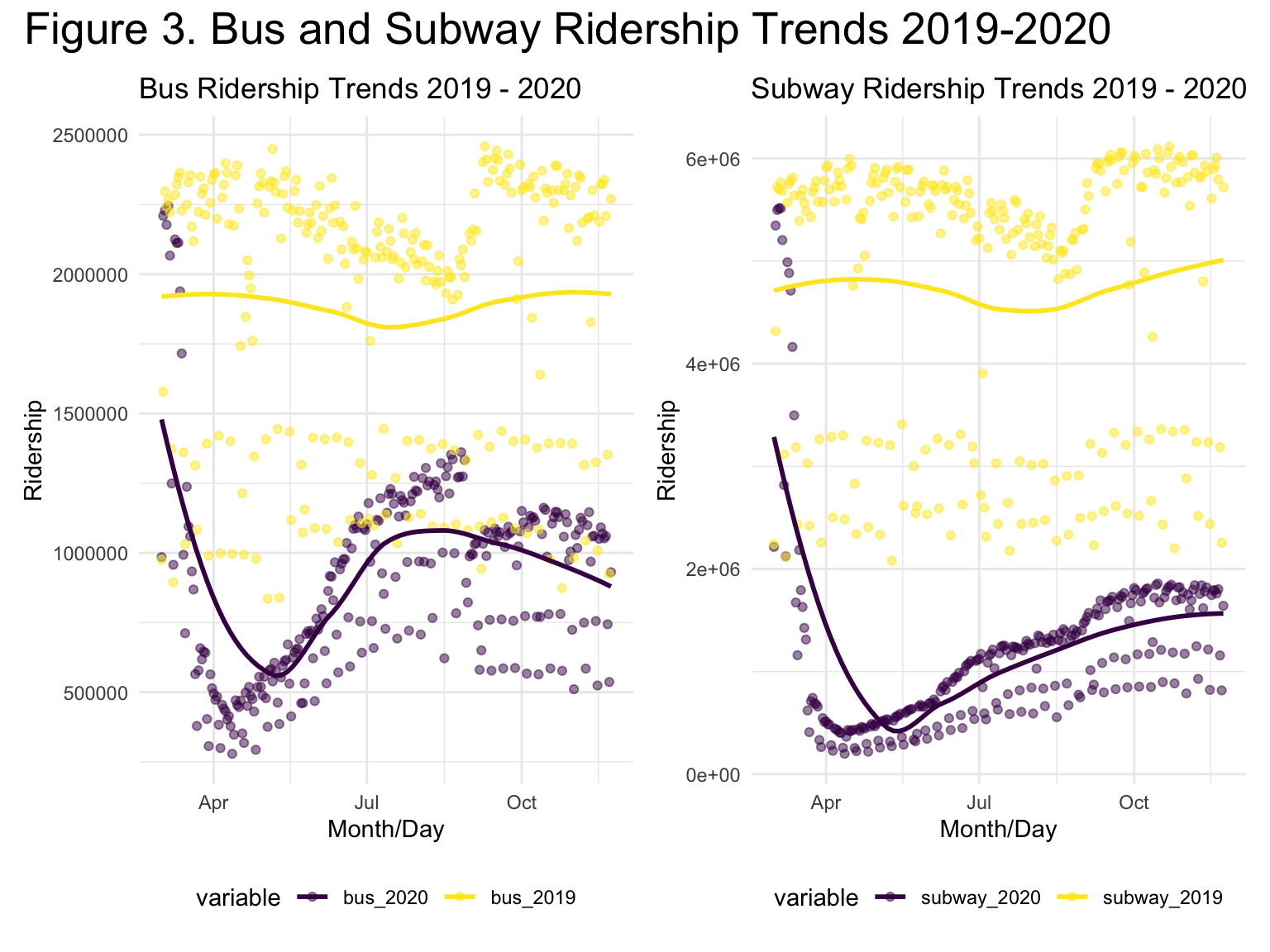 title = "Figure 2. Subway Ridership Trends 2019 - 2020",